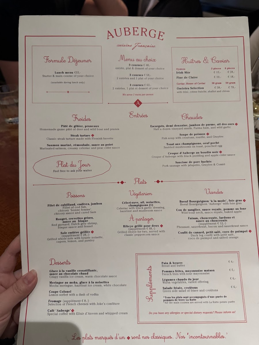 In addition to these signature dishes, the Terrine Royale D’Auberge provides a rich, decadent experience, while the Oesters (oysters) offer a fresh and briny taste of the sea. The Cuisses De Grenouille, or frog legs, are another daring option for adventurous eaters, cooked to crispy perfection with a delicate, subtle flavor.