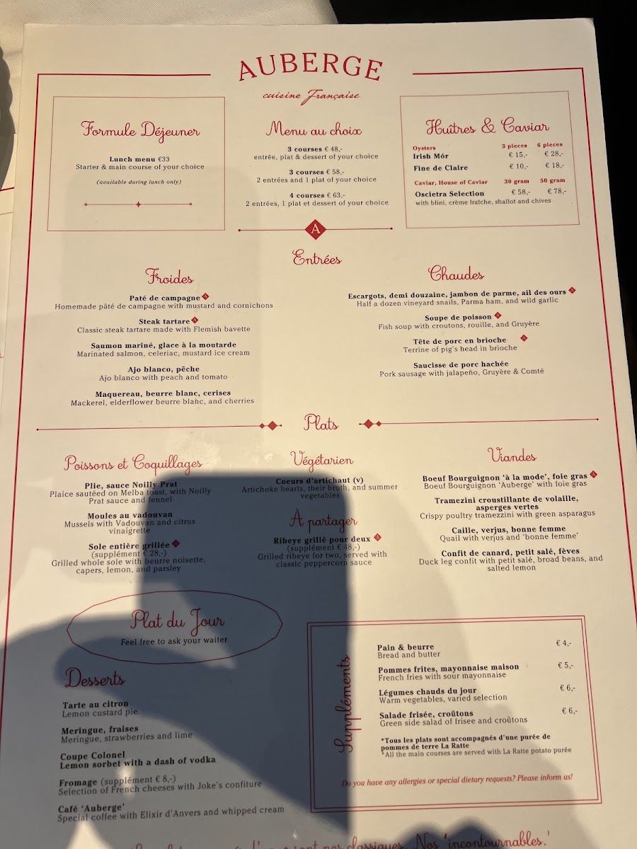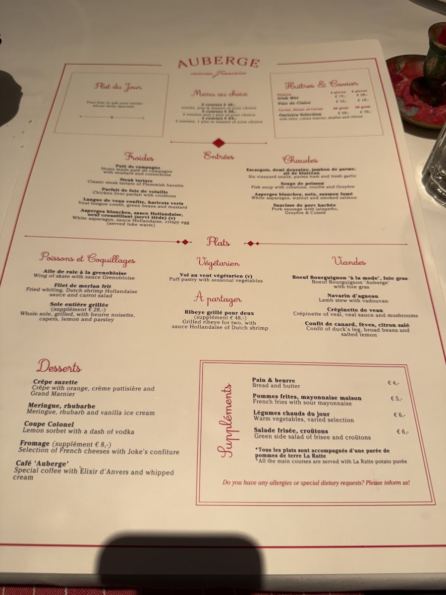 Overall, the menu at Auberge Cuisine Française is a celebration of French culinary traditions, with every dish offering a unique, memorable experience. Whether you are in the mood for seafood, meat, or a luxurious dessert, the restaurant caters to every craving with finesse and attention to detail.